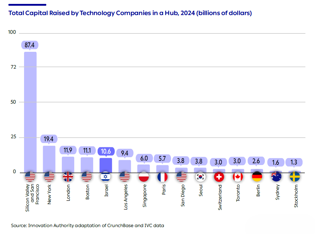 In 2024, Israel was the fifth-largest hub in the world in terms of capital raised – with total fundraising of USD 10.6 billion, similar to its global position in 2023.