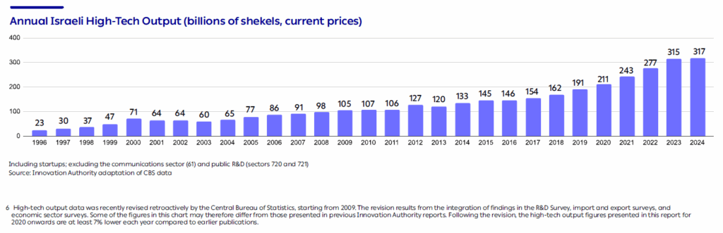 Recent years have been characterized by stagnation in high-tech output growth, similar to that observed in high-tech employment. In 2024, high-tech output totaled NIS 317 billion, constituting about 17.3% of Israel’s GDP.1High-tech output data was recently revised retroactively by the Central Bureau of Statistics, starting from 2009. The revision results from the integration of findings in the R&D Survey, import and export surveys, and economic sector surveys. Some of the figures in this chart may therefore differ from those presented in previous Innovation Authority reports. Following the revision, the high-tech output figures presented in this report for 2020 onwards are at least 7% lower each year compared to earlier publications. This means that high-tech output remained almost unchanged compared to 2023 (approximately NIS 315 billion), with high-tech output growth coming to a virtual halt at a rate lower than that of overall GDP growth.