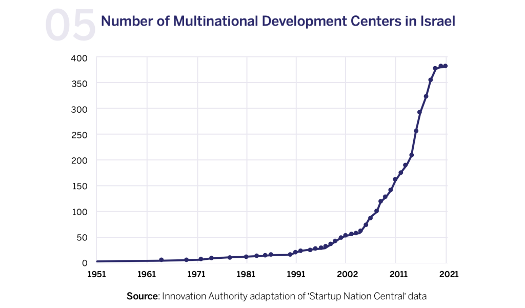 One of the prominent trends in Israeli high-tech during recent years is the moderation in the rate at which multinational corporations are opening new development centers in Israel. While 46 new international development centers were opened in Israel in 2015, only 23 such centers were opened in 2019 and only 4 in 2020. This trend reflects the decline in the number of Israeli startups’ M&A (mergers and acquisitions) deals and the increase in the number of initial offerings (IPOs) of Israeli companies on the stock exchange, as detailed in the previous chapter. This is because most of the multinational development centers in Israel were set up following the acquisition of a local startup company by an international corporation.