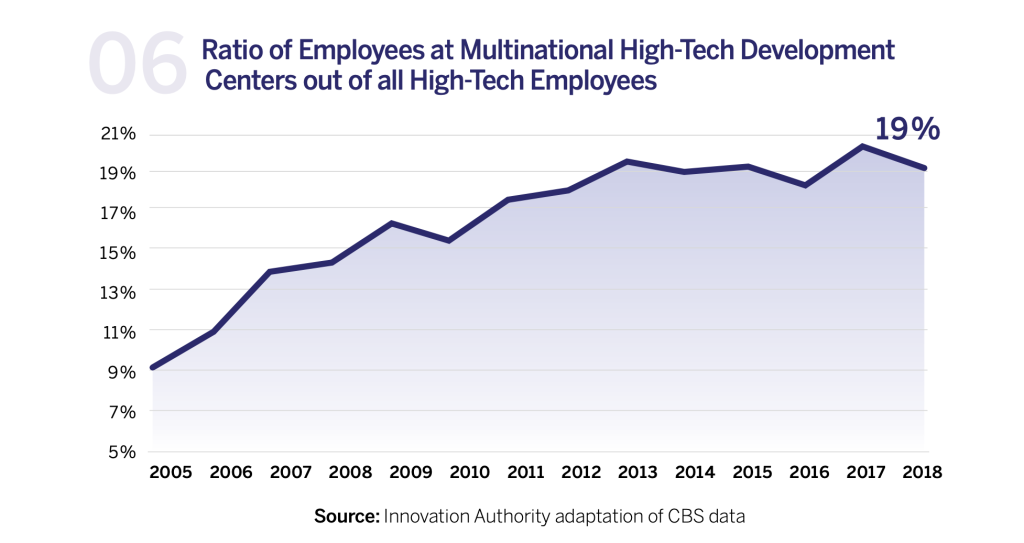 International corporations have a mixed influence on the local ecosystem. On the one hand, as mentioned in the previous chapter, the development centers’ importance is rooted in the fact that they enable employment at the forefront of global knowledge and technology and expose Israeli employees to advanced international management methodologies. On the other hand, the multinational development centers employ large numbers of employees with high technological skills while the Israeli high-tech labor market suffers from a chronic shortage of such employees. The Israeli high-tech industry is maturing and has a growing number of locally owned companies. If the downturn in the opening of new development centers continues, local companies may find themselves in a position to benefit, with proficient and skilled technology employees being able to integrate into Israeli companies, thereby contributing to their growth and transformation into complete local companies. This, in turn, will widen the circle of high-productivity employment, including auxiliary workers not employed in core technology roles, who will then also pay higher rates of income tax.