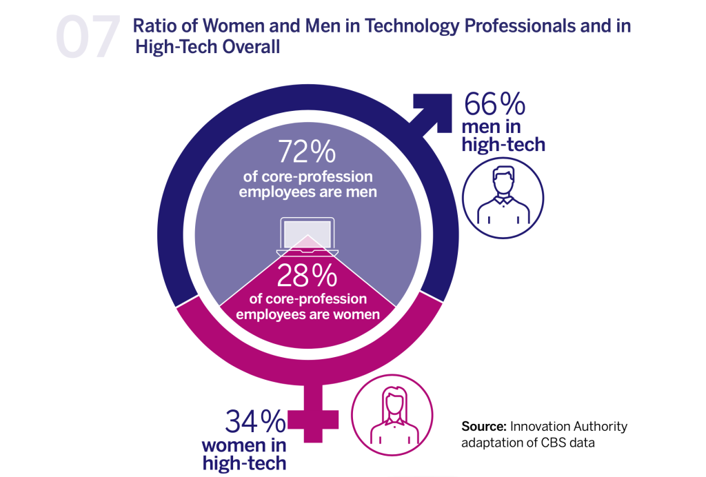 Israeli high-tech continues to maintain its standing as a relatively closed and homogenous circle, based largely on non-Haredi (ultra-Orthodox) Jewish men. CBS data reveals that 98% of high-tech employees in Israel are Jewish (1.9% are Arabs), of which 3.4% are ultra-Orthodox.5Innovation Authority adaptation of CBS data, “High-Tech Employees, Excluding the Communications Sector, Ultra- Orthodox and Arabs, 2001-2020. Furthermore, this industry is characterized by an especially high ratio of male employees – two thirds of all those working in this field.6Innovation Authority adaptation of CBS data, “Salaried Employees in High-Tech According to Occupation (1994 Classification) and Sex, 1995-2012 and “Salaried Employees in High-Tech, Excluding the Communications Sector, According to Occupation (2011 Classification) and Sex, 2012-2018.