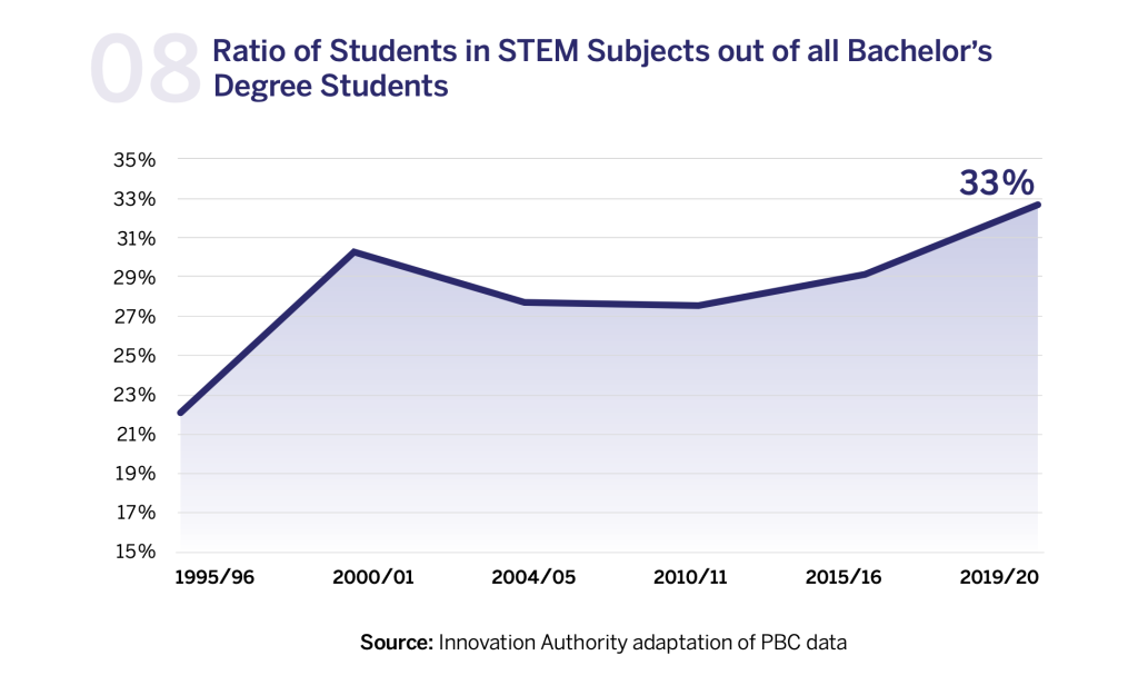 An examination of the future high-tech professionals, influenced by the number of students in high-tech study courses, shows that there has been a significant increase in the number of students acquiring higher education in technology subjects in recent years. In the current 2020-21 academic year, 18.4% of all bachelor’s degree students are studying engineering subjects – the most popular study course in Israel. Furthermore, the number of students studying mathematics, statistics, and computer science has doubled over the last decade, from 9,122 in 2020 to 18,243 in the current academic year. In other words, as of 2020, one in every four students in Israel is studying for a bachelor’s degree in a technology study field such as engineering or computer science. Moreover, one of every three students in Israel today is studying for a bachelor’s degree in a science (STEM) subject,29STEM subjects are science, technology, engineering, and mathematics. an increase of 22% since 1995.30Innovation Authority adaptation of PBC data, “Opening of the 2020-21 Academic Year with Covid”.