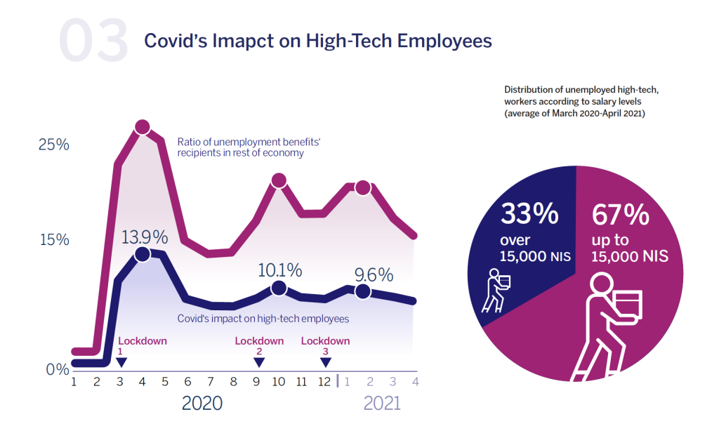 Alongside the rise in the number of high-tech employees following the Covid crisis, there was also a sharp increase in the number of people receiving unemployment benefits, primarily among those earning lower than average high-tech salaries. The level of unemployment benefits’ recipients who had been previously employed in high-tech sectors jumped from 2% prior to the crisis in January 2020 to a record level of almost 10% of all high-tech employees during the first lockdown period. Over the Covid year, the level of people receiving unemployment benefits remained at an average of 10%, significantly higher than the figure for previous years and, as of April 2021, this figure stands at 8.2%. Nevertheless, throughout 2020, the level of high-tech personnel receiving unemployment benefits remained significantly lower than other industries where it exceeded 25% during the first lockdown period.2Unemployment benefit recipients are defined as those unemployed or employees on unpaid leave. As can be seen in the graph below, the level of high-tech personnel receiving unemployment benefits increased during each of the lockdowns imposed on the economy – in March, September, and January.