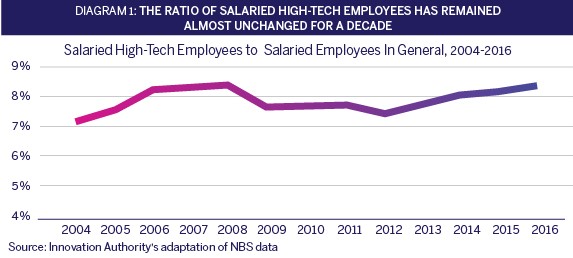 One of the central questions surrounding the discussion about the shortage of skilled high-tech employees is why it is that the high salary, that reflects the high demand for these workers, is not enough to attract more workers to choose this career path. The significance of the disparity between the average wage in the high-tech industry – NIS 21,000 per month – and the average wage in the economy at large – approximately NIS 9,8001 National Bureau of Statistics, Annual Statistics Journal 2017, Panel 12.33 (2016 data). This large difference becomes even more significant taking into account the complex high cost of living in Israel. Nonetheless, the figures indicate a more than decade-long stability in the ratio of salaried employees working in high-tech (see Diagram 1)2, Calculated after adaptation of NBS data by the Strategy and Economic Division of the Innovation Authority. The adaptation included revaluation and historic adjustment of all salaried employees by retroactively adding the number of salaried employees in the I.D.F. (regular and permanent service) including before 2012 (the year in which the NBS began publishing the total figure).compared to a thriving corporate demand for labor expressed by a constant increase in salaries.