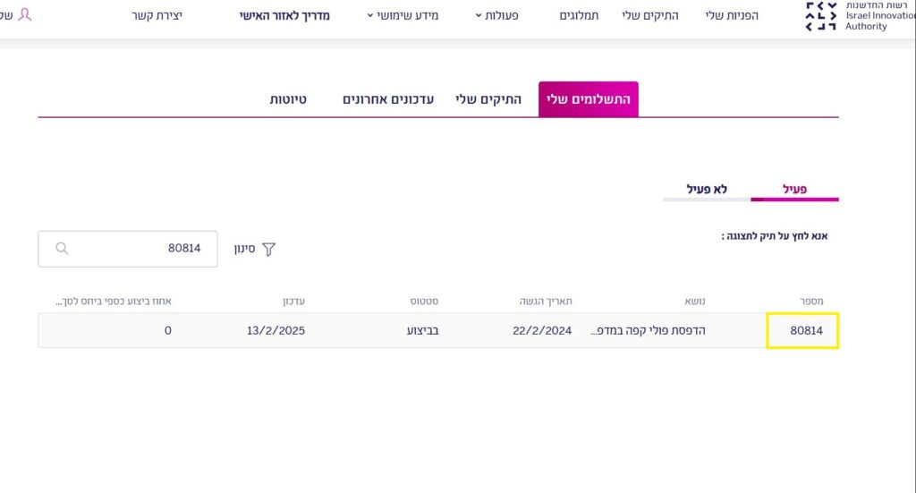 באזור 'התשלומים שלי' שבאזור האישי, אפשר להתעדכן בדיווחים הכספיים התקופתיים שהגשתם ושכבר נבדקו על ידי מחלקת התשלומים, ולקבל מידע על סטטוס הטיפול בהם.