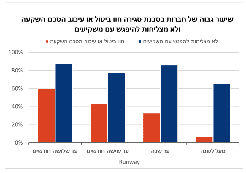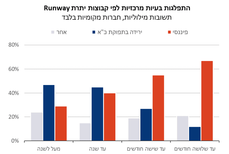 בחינה של התשובות המילוליות לפי אורך ה-Runway של החברה מעלה כי, כצפוי, ככל שתקופת המזומנים של החברה מדולדלת יותר נושאי יכולת הגיוס וההכנסות קריטיים יותר, לעומת הירידה בתפוקת כ”א: