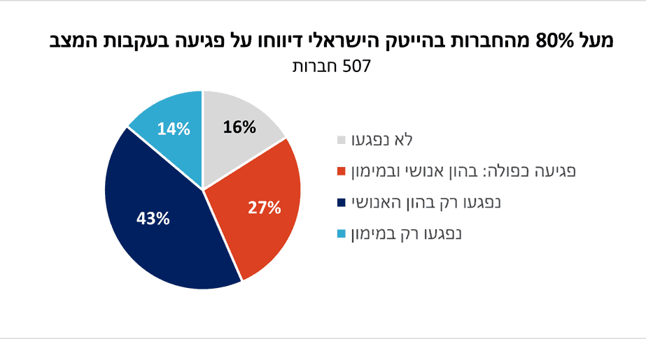 יותר מ-80% מהחברות דיווחו על פגיעה בעקבות המצב. מעל לרבע מהחברות דיווחו על פגיעה כפולה, הן  בהשגת מימון והן בהון אנושי.