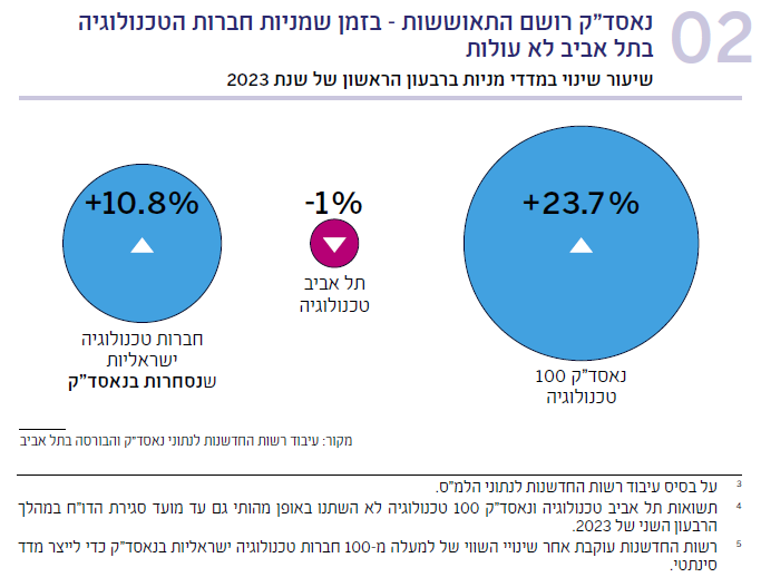 החודשים הקרובים יהיו קריטיים להיי-טק הישראלי. ניסיון העבר מלמד כי לרוב, שני רבעונים לאחר שמתחילה התאוששות בשוק ההון בוול סטריט, המתבטאת בעליית מדד נאסד״ק, ישנה גם עלייה בגיוסי הון ועובדים בהיי-טק הישראלי.7 לאור העלייה בנאסד״ק כפי שהוצגה מאז תחילת השנה, במצב עניינים רגיל ניתן היה לצפות לעלייה בגיוסי ההון והעובדים בישראל כבר במהלך חודשי קיץ 2023. על פי האינדיקציות שהוצגו עד כה, ומקבלות חיזוק מנתוני אפריל ומאי, יש חשש אמיתי של מגמת היפרדות בין ההיי-טק הישראלי למגמות העולמיות.