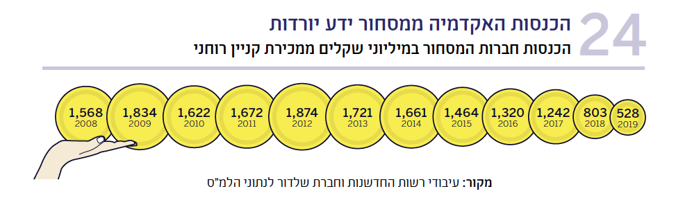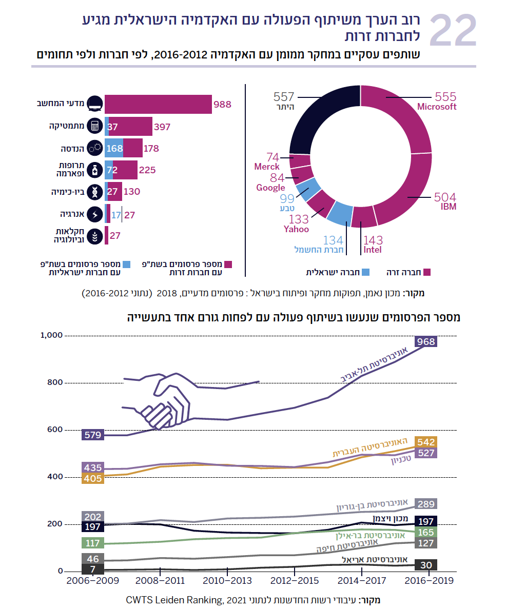 מבחינת האקדמיה הישראלית, היא עשויה למצוא בחברות התעשייה הישראליות, אליהן זרם הון משמעותי בשנים האחרונות, מקור לשאלות מחקר חדשניות בעלות פוטנציאל מסחרי גבוה. שיתופי פעולה אלה עשויים להביא לגידול גם במספר המאמרים האיכותיים היוצאים מישראל, הנמוך ביחס למדינות ההשוואה,14 וגם בהכנסות החברות למסחור הידע באקדמיה. הכנסות אלה ספגו ירידה מתמשכת ומשמעותית מכ-1.9 מיליארד שקלים בשנת 2012 לכ-500 מיליון שקלים בלבד בשנת 2019. כמו כן, שיתוף פעולה זה עשוי גם להגדיל את מספר חברות ההזנק, המבוססות על ידע אקדמי, אשר מספרן אמנם נמצא במגמת עלייה מסוימת בשנים האחרונות, אך עדיין עומד על עשרות בודדות מדי שנה.