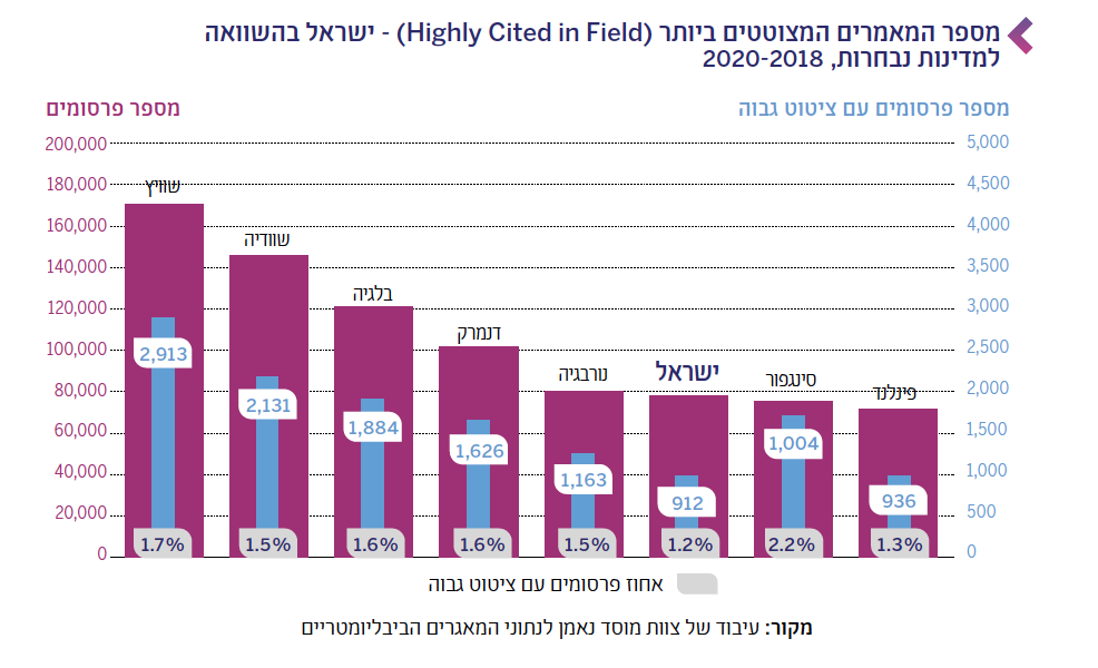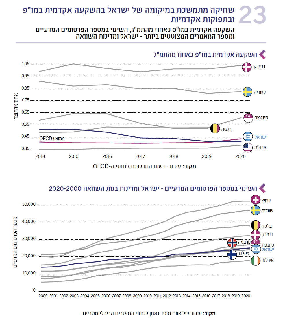 דירוגה הבינלאומי של ישראל במדד של השקעה במו״פ לנפש גבוה ומשתפר, והיא מדורגת במקומות הראשונים בעולם. לעומת זאת, יש מגמה הפוכה בדירוג של ההשקעה האקדמית במו”פ לנפש בישראל (ממקום שלישי ב-OECD בשנת 2006 למקום 26 בשנת 2018).