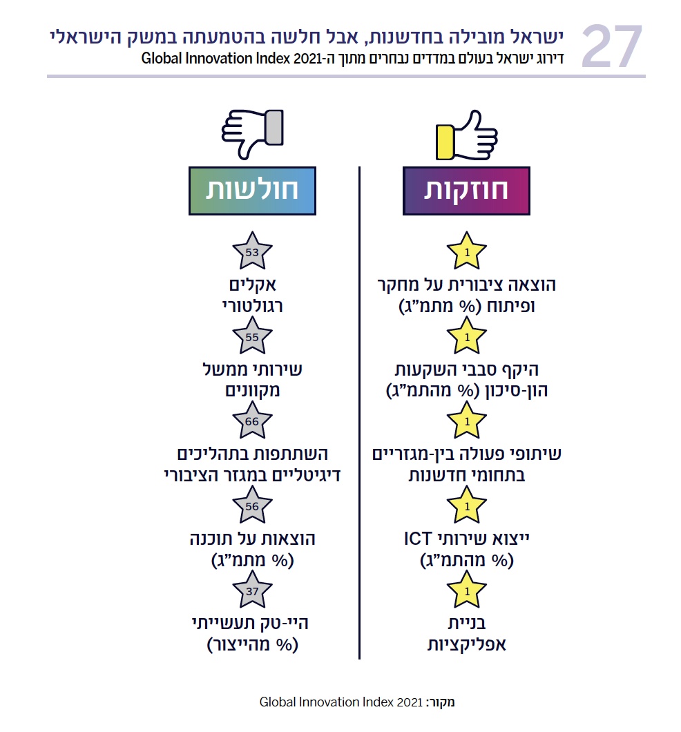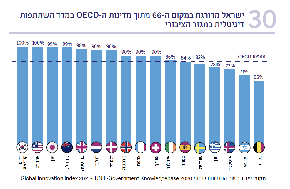 בעוד חברות הטכנולוגיה הישראליות נמצאות בחוד החנית של החדשנות העולמית, לעיתים קרובות הפיתוחים שלהן יוצאים מחוץ לגבולות ישראל והאזרחים והכלכלה כלל לא נהנים מהם. בנוסף, קיים פער בין החדשנות הישראלית המזוהה עם חברות ההיי-טק המקומיות ומרכזי הפיתוח הרב-לאומיים לבין רמת הדיגיטיזציה והתשתיות הטכנולוגיות הזמינות לחברות. עדות לפער זה ניתן לראות בדירוגי ישראל בפרמטרים השונים במדד ה-Global Innovation Index לשנת 2021: מצד אחד, ישראל מדורגת במקום הראשון במדדים שונים, המעידים על רוחב ועומק ענף ההיי-טק במדינה, כגון הוצאה ציבורית על מחקר ופיתוח, היקף סבבי השקעות קרנות הון-סיכון, ייצוא מוצרי ICT ושיתופי פעולה בין-מגזריים בתחומי חדשנות. אך, מצד שני, ישראל נמצאת מתחת לממוצע במדדים אחרים הנוגעים לתשתיות הקריטיות להשגת קידמה טכנולוגית כגון אקלים רגולטורי, השתתפות בתהליכים דיגיטליים במגזר הציבורי, אחוז הוצאה על תוכנה מתוך התמ”ג ועוד.20