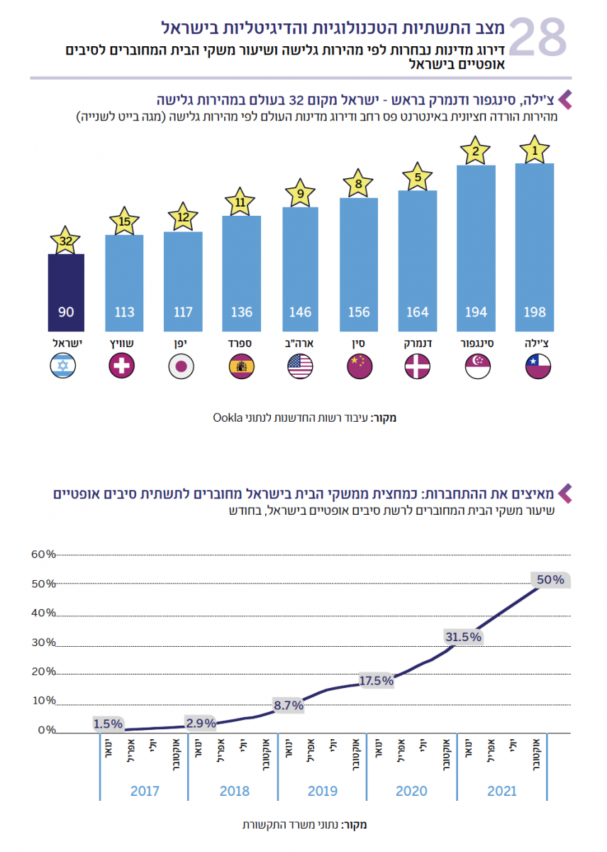 קצב פרישת תשתיות התקשורת המתקדמות בישראל – באמצעות סיבים אופטיים – הואץ לאחרונה והגיע לכ-50% ממשקי הבית במדינה בסוף 2021. זאת, לאחר השקעה מסיבית לסגירת הפער.21 עם זאת, מהירות הגלישה הזמינה בישראל עדיין מפגרת אחר המדינות המובילות בעולם: ישראל מדורגת במקום ה-32 בעולם נכון לחודש פברואר 2022 עם מהירות גלישה חציונית בפס רחב של 90.42 מגה בייט לשנייה, לפי בדיקת 22Ookla.