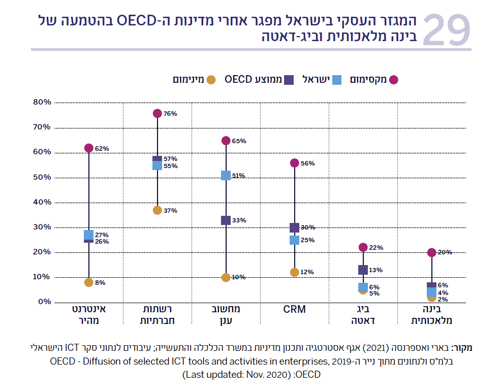 לא מפתיע, אם כך, שהמגזר העסקי והמגזר הציבורי בישראל מפגרים אחרי מדינות ההשוואה, אשר ישראל מודדת את עצמה ביחס אליהן, בכל הנוגע לדיגיטציה וחדשנות טכנולוגית. גם נתוני ה-OECD מראים כי המגזר העסקי בישראל מפגר אחרה-OECD בהטמעה ושימוש של מגוון טכנולוגיות, למשל שימוש ברשתות חברתיות, מחשוב ענן, מערכות CRM וטכנולוגיות ביג דאטה ובינה מלאכותית. בכל המדדים האלה, למעט שימוש במחשוב ענן, המגזר העסקי בישראל נמצא מתחת לממוצע השימוש במדינות ה- OECD. גם המגזר הציבורי בישראל סובל מהפער הזה: לפי דירוג האו”ם ישראל ממוקמת במקום ה 66- בהשתתפות בתהליכים דיגיטליים של המגזר הציבורי.23 אחד האתגרים המשמעותיים לדיגיטציה של המגזר הציבורי בישראל הוא המחסור בכלי עיבוד שפה טבעית. בהקשר הזה יש שני חסמים מרכזיים: היעדר תמריץ כלכלי לשוק הפרטי בשל קוטנו של השוק, לצד מחסור במאגרי מידע הדרושים כדי לאמן מודלים של עיבוד שפה טבעית. לכן, בתוכנית הלאומית לבינה מלאכותית המדינה משקיעה 180 מיליון שקלים בפיתוח כלי עיבוד שפה טבעית בשפות שמיות (עברית וערבית).