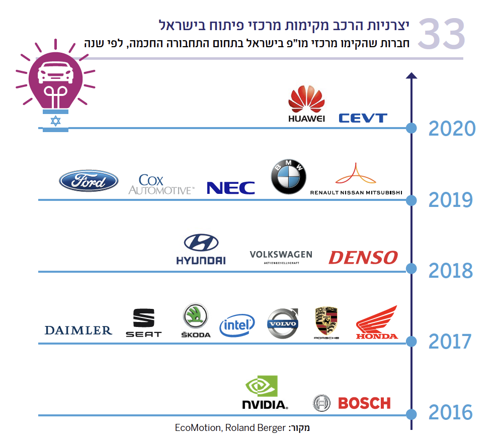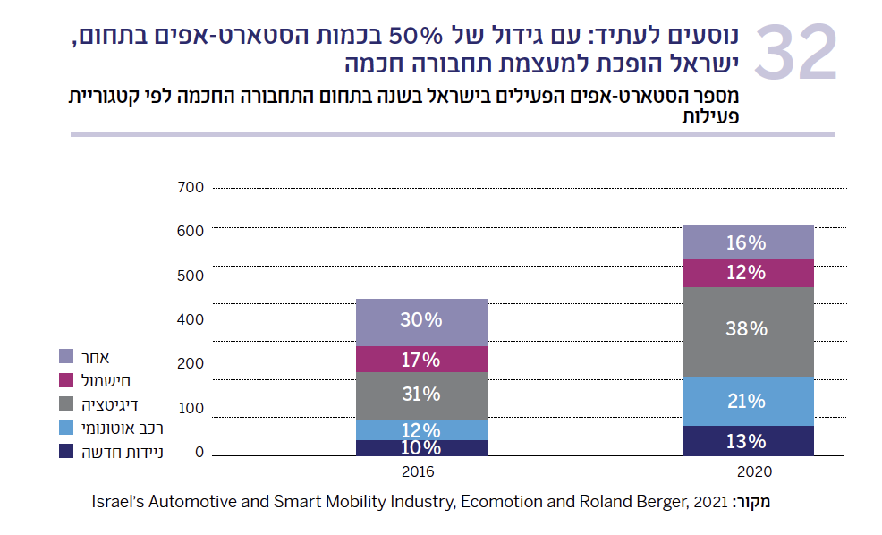 על אף שבאופן היסטורי ישראל אינה מעצמת רכב, בעידן שבו כלי הרכב הופכים לחכמים ונוהגים את עצמם, ישראל קנתה לעצמה מקום מוביל בתחום בשנים האחרונות. מספר הסטארט-אפים הישראלים בתחום התחבורה החכמה גדל מ-400 ב-2016 ליותר מ-600 ב-2020. הצמיחה המשמעותית ביותר הייתה במספר הסטארט-אפים שהוקמו בתחום הרכב האוטונומי עם גידול שנתי ממוצע של 26% בתקופה זו. כמו כן, מאז 2008, מעל 20 יצרני רכב מהגדולים בעולם וספקיהם פתחו מרכזי פיתוח בישראל, בהם GM, הונדה, פולקסוואגן, פורד ועוד. התחום גם מייצר פעילות עסקית משמעותית: חברות בתחום גייסו כמיליארד דולר ב-2021. בנוסף, אחד מסיפורי ההצלחה הגדולים שיצאו מישראל בעשור האחרון הוא חברת מובילאיי (Mobileye) מירושלים. החברה הוקמה על ידי פרופ’ אמנון שעשוע וזיו אבירם ופיתחה טכנולוגיה למערכות סיוע מתקדמות לנהג (ADAS), שגם משמשות לפיתוח טכנולוגיות לרכבים אוטונומיים (ללא נהג). ב-2014 מובילאיי הונפקה לפי שווי של למעלה מחמישה מיליארד דולר, בהנפקה שהתפרסמה בשעתה בתור ההנפקה הגדולה ביותר של חברה ישראלית. ב-2017 נרכשה החברה על ידי אינטל ביותר מ-15 מיליארד דולר בעסקת הרכישה הגדולה ביותר של חברה ישראלית.