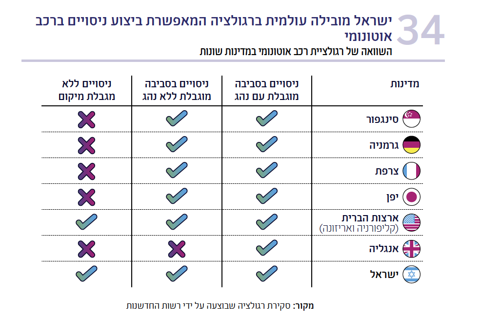 בחודש מרץ השנה נכנס לתוקפו חוק תקדימי שנוסח בהובלת משרד התחבורה והבטיחות בדרכים, בליווי משרד המשפטים ובתמיכה מקצועית של רשות החדשנות, וזאת בהמשך להחלטת ממשלה מ-2017 בנושא הקמת תוכנית לאומית לתחבורה חכמה. החקיקה תהפוך את ישראל לזירת ניסויים ברכב אוטונומי ברמות הגבוהות ביותר של נהיגה אוטונומית, כך שלמשל הניסויים יוכלו להיערך ללא נוכחות של נהג בטיחות ברכב. בין המדינות המובילות בנושא לצד ישראל, ניתן לציין את קליפורניה ואריזונה שבארצות הברית ומדינות נוספות באירופה – גרמניה וצרפת, ובמזרח אסיה – יפן וסינגפור. ישראל מאפשרת לבדוק פתרונות להסעת נוסעים ומתן שירותים מסחריים ברכב אוטונומי, מה שצפוי להפוך את ישראל למוקד בינלאומי אטרקטיבי לפעילות הדגמה והטמעה. הייחודיות בארגז החול של ישראל היא אפשרות לבצע הפעלה של רכב אוטונומי ללא נהג באופן מסחרי בכל מקום וללא תנאים מגבילים. אפשרות זו מוכרת גם כרמת אוטונומיות דרגה 5, וזאת למרות שרכבים אוטונומיים ברמה 5 טרם פותחו באופן מלא. כך, למעשה, מדינת ישראל הכינה תשתית רגולטורית לטכנולוגיה עתידית ותוכל להתקדם לפיילוטים של כלי רכב ברמה אוטונומית מלאה לכשתגיע הטכנולוגיה הזו תגיע לשוק.