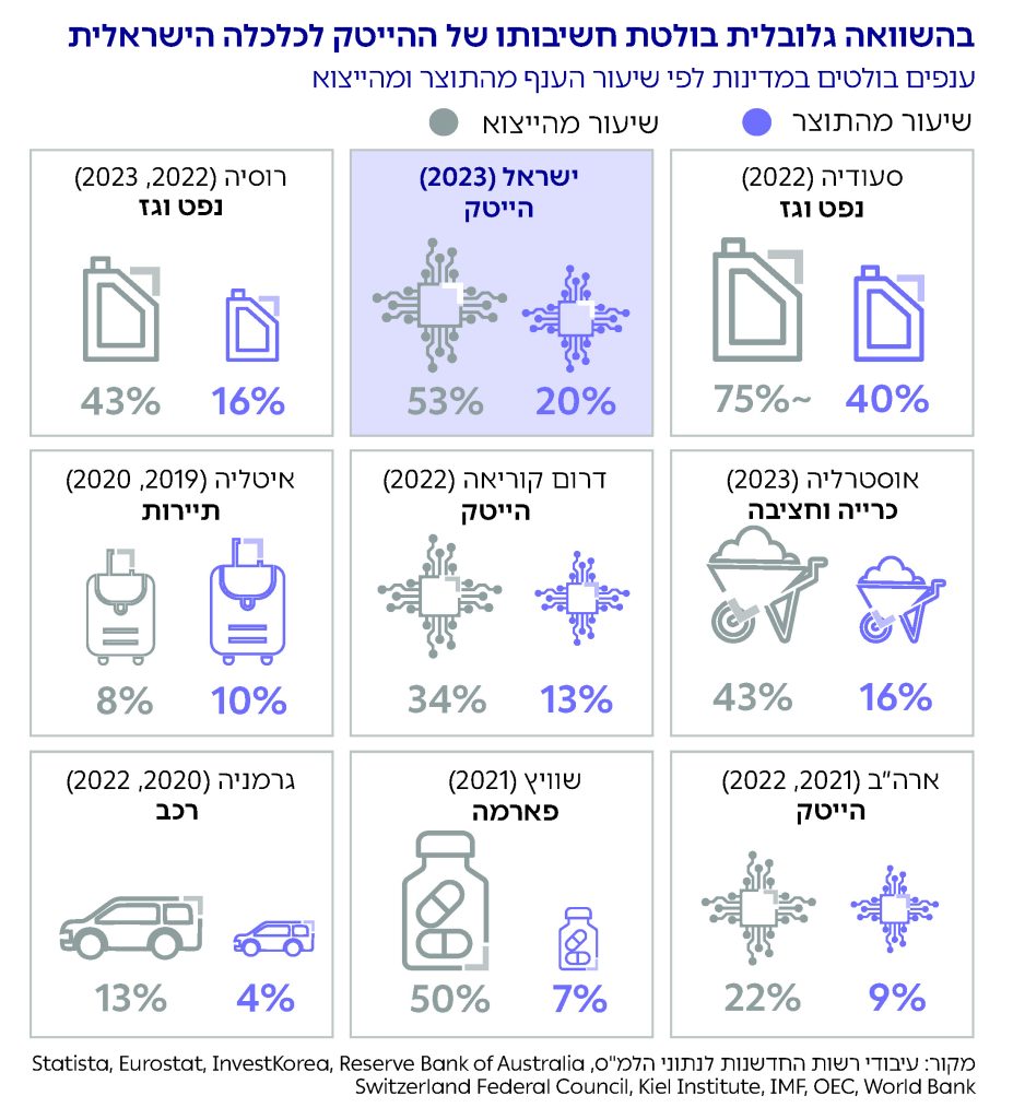 בהסתכלות בין-לאומית, מרכזיות ההייטק בכלכלה הישראלית היא תופעה ייחודית. משקלו בתוצר הישראלי – כ-20% – דומה לזה של מחצבי טבע כמו נפט וגז בכלכלות של המדינות הנשענות עליהם. גם חלקו של ההייטק בייצוא גבוה מאוד ועומד בישראל על יותר מ-50% בשנים האחרונות. בדרום קוריאה, לדוגמה, מדינה שבה בדומה לישראל ההשקעה במו״פ כאחוז מהתוצר היא גבוהה מאוד – ענף ההייטק מהווה 13% מתוצר המדינה וכשליש מהייצוא. בארה”ב, ביתם של ההאבים הטכנולוגיים המובילים בעולם, ענף ההייטק היווה פחות מ-9% מהתוצר ב-2022 ופחות מרבע מכלל הייצוא ב-2021.
