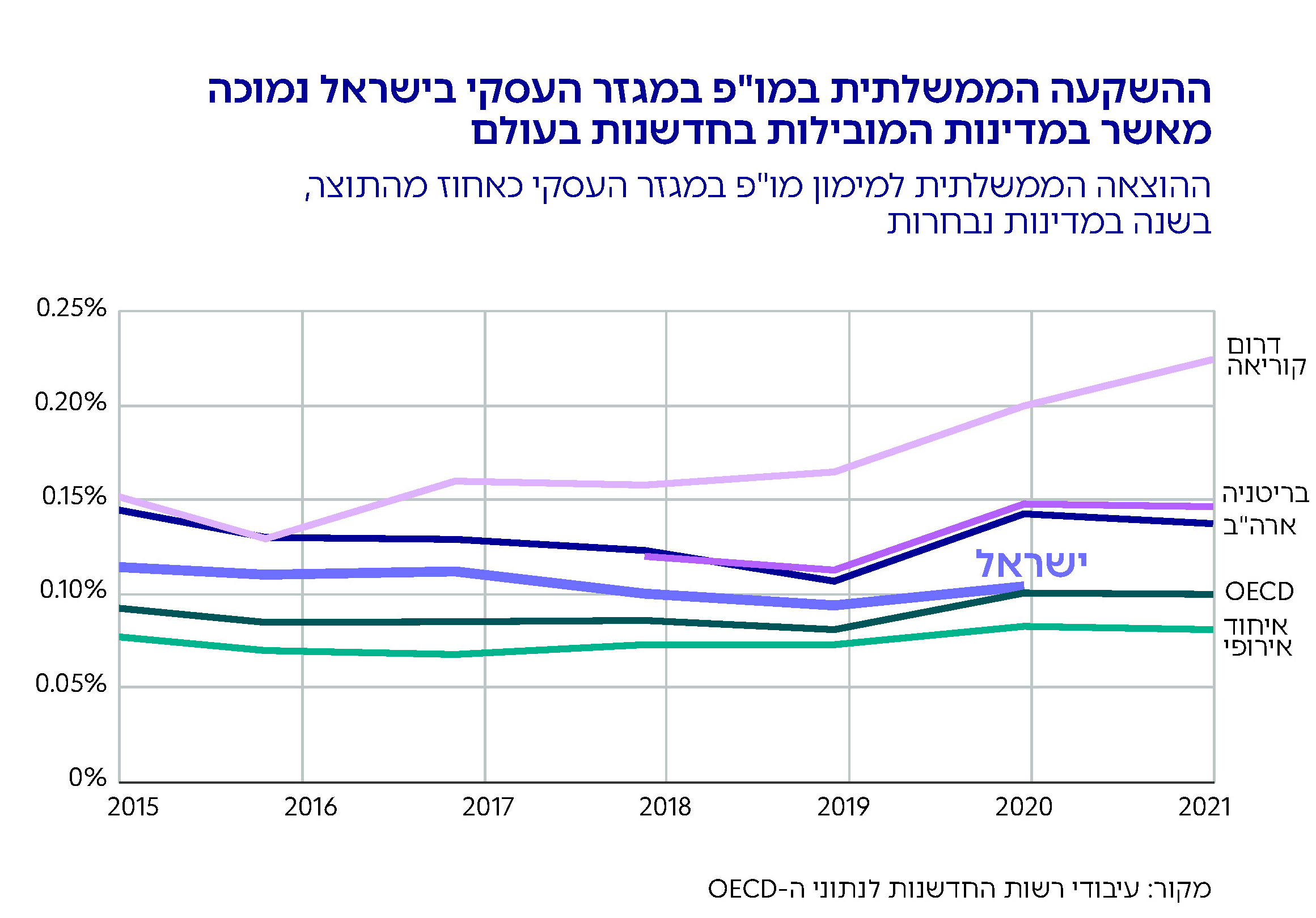 בהשוואה בין-לאומית, ניתן לראות כי בישראל חלקה של המדינה במימון פעילות המו”פ במגזר העסקי במונחי אחוזי תוצר, דומה לממוצע ה- OECD אך נמוך באופן משמעותי ממדינות הנחשבות למובילות עולמיות בחדשנות, כמו ארה”ב, קוריאה ובריטניה.