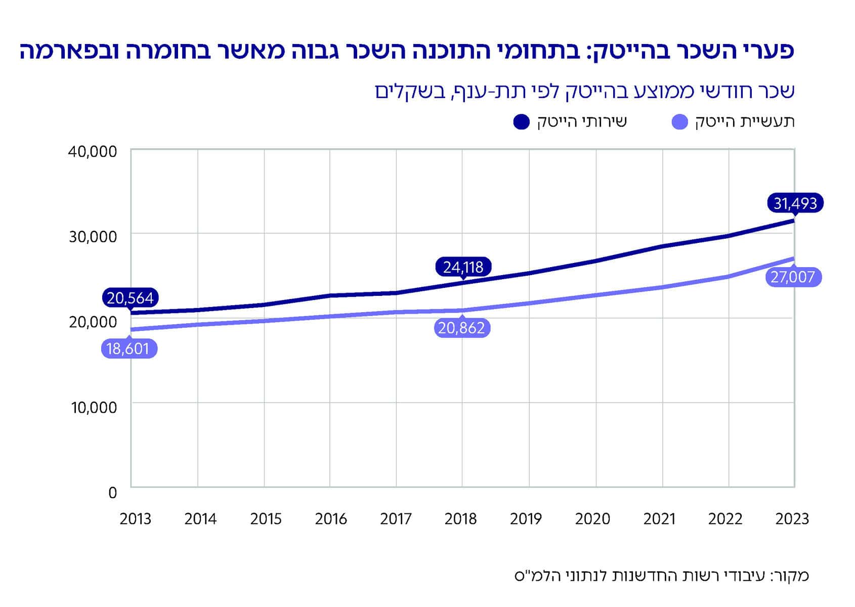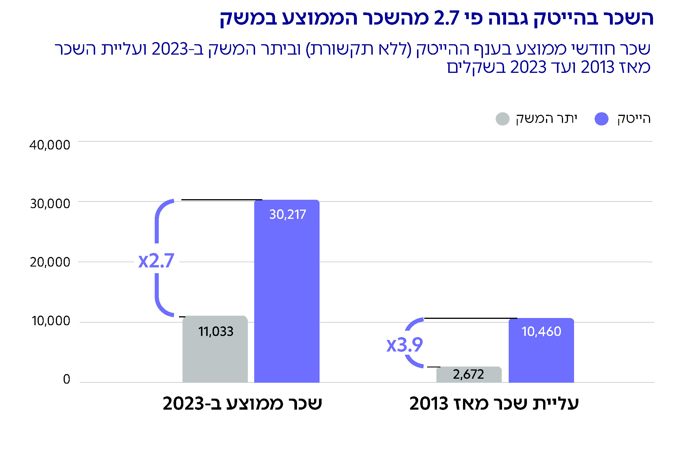 במבט רחב, מאז 2013 ועד 2023 עלה השכר החודשי הממוצע בהייטק ב-10,460 שקלים, עלייה של כ-53%. בשאר המשק השכר החודשי הממוצע עלה באותה תקופה ב-2,672 שקלים – עלייה של כ-32%.