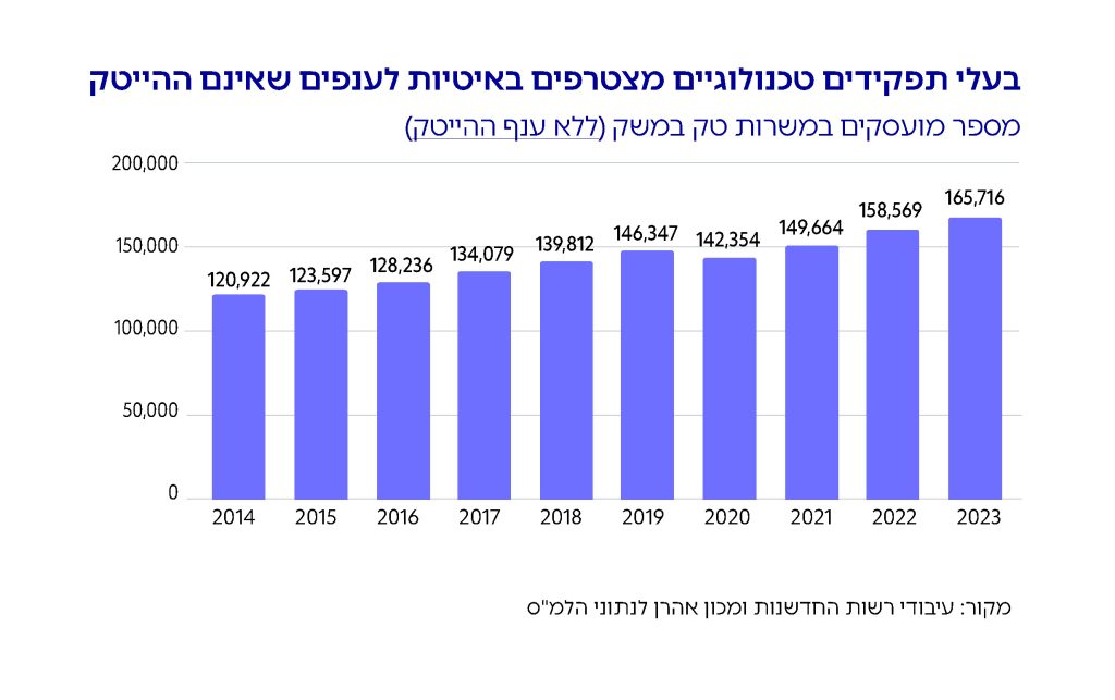 ב-2023 הועסקו 165.7 אלף איש במשרות טק מחוץ לענף ההייטק. בתקופה של עשור עלה מספר המועסקים במשרות טק במשק ב-45 אלף משרות. באותה התקופה הוכפל מספר המועסקים בתפקידים טכנולוגיים בענף ההייטק וגדל בלמעלה מ-96 אלף מועסקים. כלומר, ביתר הענפים מחוץ להייטק, קצב הגידול במספר המועסקים בתפקידים טכנולוגיים, איטי יותר ביחס לענף ההייטק. בנוסף, ניכר כי במשבר הקורונה (2020), נעצר גיוס העובדים לתפקידים הטכנולוגיים במשק ומספרם הצטמצם, בזמן שענף ההייטק צמח בשיעורים גבוהים.