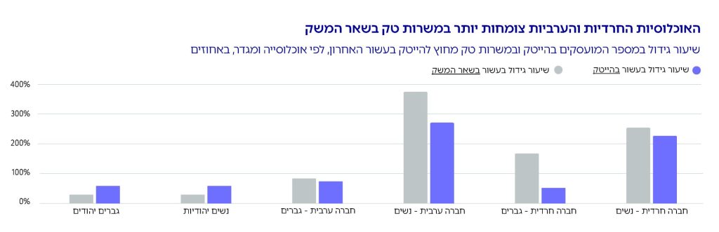 כאשר בוחנים את הגידול במספר העובדים בתפקידים טכנולוגיים בהייטק וביתר המשק בחלוקה לאוכלוסיות, נראה כי התפקידים הטכנולוגיים במשק הם הזדמנות כניסה לתעסוקה איכותית של עובדים מאוכלוסיות בתת-ייצוג בהייטק וליצירת צמיחה מכלילה. שיעורי הגידול בעשור האחרון של נשים ערביות, גברים חרדים ובמידה פחותה נשים חרדיות, היו גבוהים באופן יחסי לקצב ההצטרפות שלהם לענף ההייטק במהלך העשור.