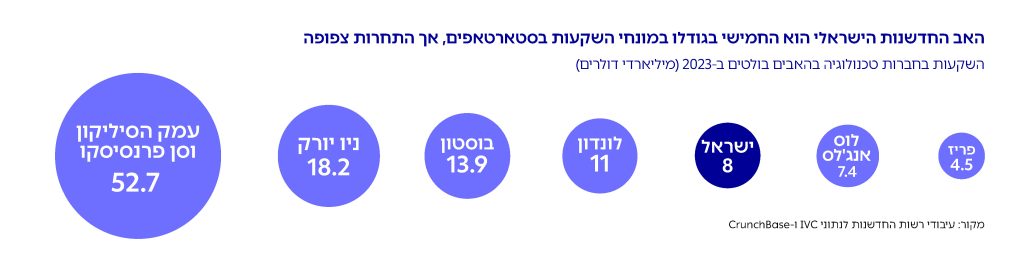 התחרות בין ההאבים השונים באה לידי ביטוי גם בתחרות על ההשקעות בסטארטאפים, בין אם אלו השקעות ישירות בחברות טכנולוגיה או בקרנות שמשקיעות בהן. כפי שהוצג, בישראל חלה ירידה חדה בשנתיים האחרונות בהשקעות בסטארטאפים – ירידה חדה יותר מאשר ברוב ההאבים שנבדקו.
