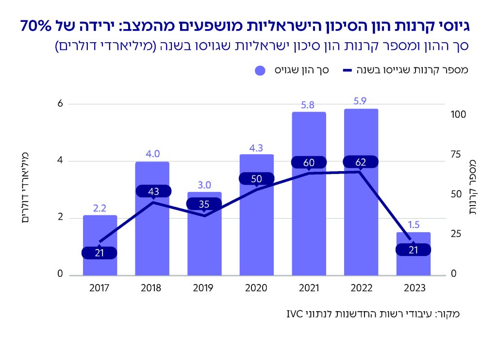 ב-2023, סך גיוסי קרנות הון סיכון בישראל ירד בכ-75% ביחס לשנת 2022 וב-67% בהשוואה לממוצע הגיוס בין השנים 2022-2018.