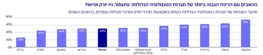 מהבדיקה עולה כי המקומות בהם קיים הריכוז הגבוה ביותר של החברות הרב-לאומיות הגדולות ביותר באמצעות מרכזי מו״פ ומרכזי פעילות עסקיים, אינם בהכרח ההאבים הגדולים ביותר גם במונחי השקעות בסטארטאפים או בקרנות הון סיכון מקומיות. ההאבים המובילים מבחינת ריכוז חברות הטכנולוגיה הגדולות הם סינגפור, ניו יורק וסיאול. עוד עולה כי שיעור הנוכחות של חברות הטכנולוגיה הגדולות בישראל דומה לזה שנמדד בבוסטון ועמק הסיליקון. המשך הדיון בנושא התחרות על נוכחות חברות רב-לאומיות בהאב החדשנות מופיע בסוגיה מספר 4 במסמך זה.