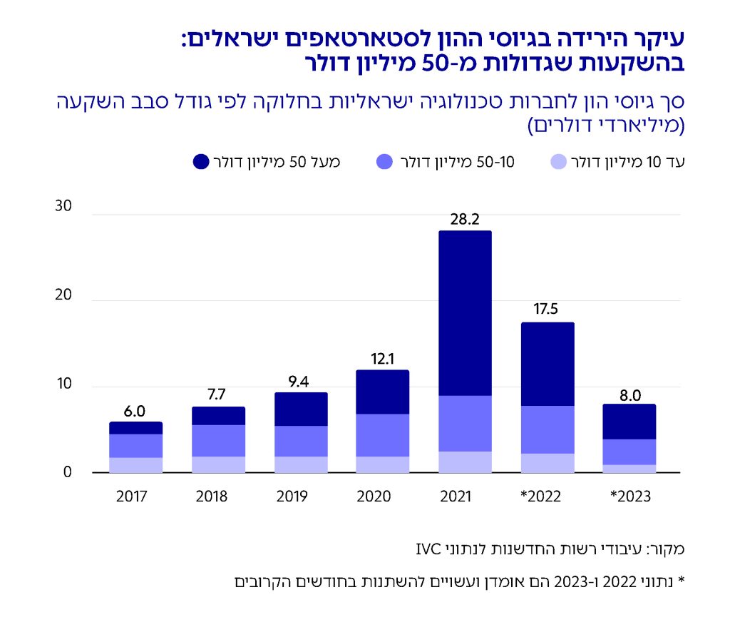 כפי שהוצג, מאז 2021 חלה מגמת ירידה בהשקעות בסטארטאפים ישראלים. עיקר הירידה חל בהשקעות בסבבי גיוס הון גדולים של מעל ל-50 מיליון דולר. סבבי גיוס אלה תדלקו את הצמיחה של חברות טכנולוגיה ישראליות עצמאיות ובוגרות.