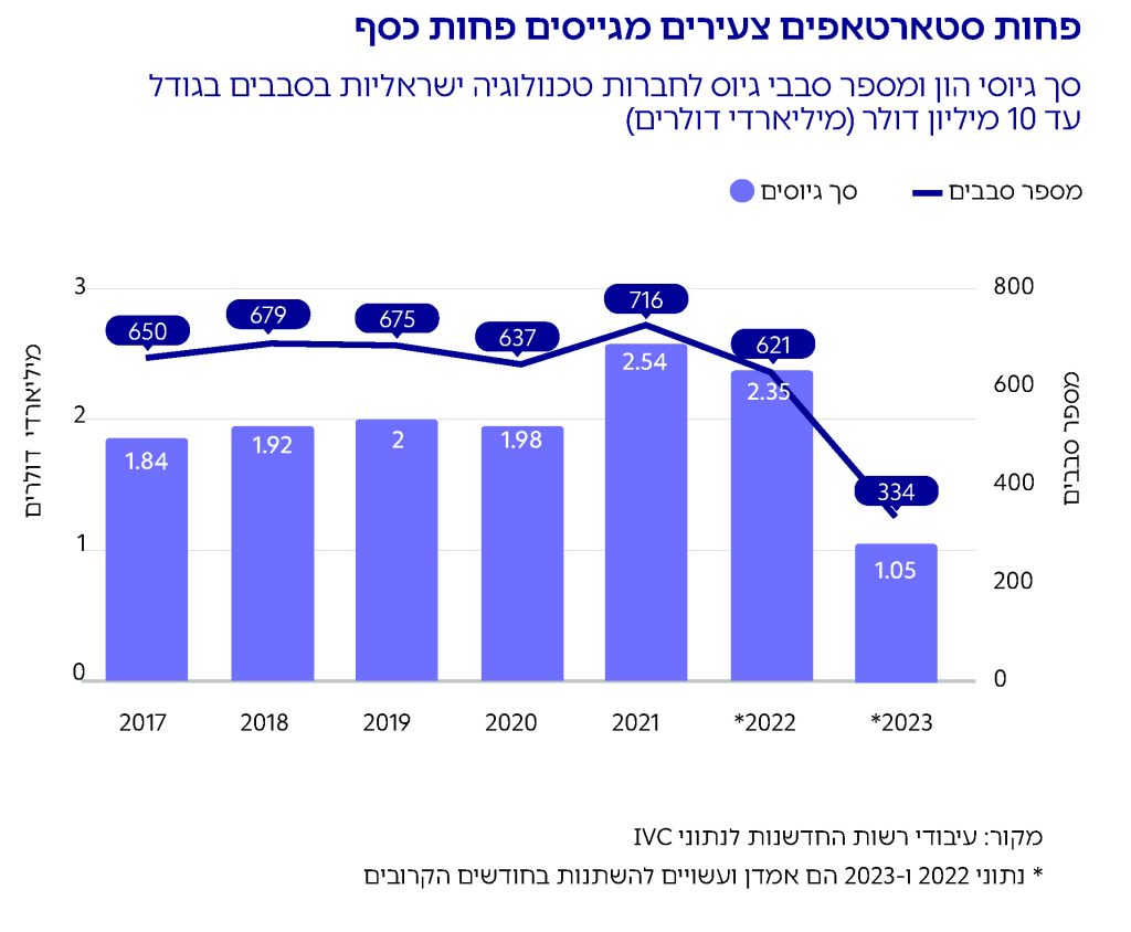 יחד עם זאת, גם בסבבי גיוס ההון בשלבים המוקדמים חלה ירידה משמעותית. ב-2017, כ-30% מסך ההון שסטארטאפים ישראלים גייסו היה בהשקעות הקטנות מ-10 מיליון דולר. ב-2023 שיעור זה ירד ל-13%. ההון שהושקע בסבבים בשלבים המוקדמים קטן לא רק באופן יחסי, אלא גם באופן מוחלט: ב-2017 הוא היה 1.8 מיליארד דולר, וב-2023 פחות ממיליארד דולר.