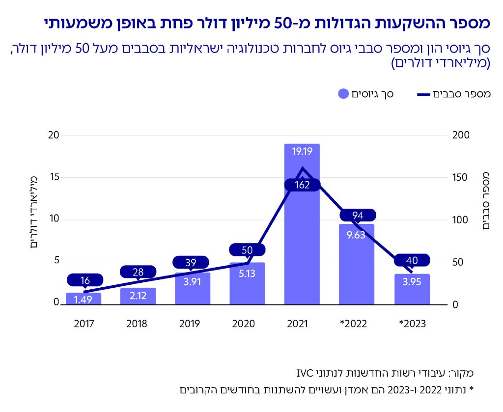 העשור האחרון אופיין בתנודתיות גבוהה בסבבי ההשקעות הגדולים של הסטארטאפים ישראלים. ב-2017, כ-25% מההון שגויס באותה שנה היה בסבבים שכל אחד מהם היה גדול מ-50 מיליון דולר. ארבע שנים מאוחר יותר, ב-2021, שיעור זה עלה ל-70%, ולאחר שנתיים של ירידה הגיע ל-50% ב-2023. ירידה זו מסבירה את עיקר הירידה בהשקעות בחברות טכנולוגיה בישראל בשנה האחרונה.