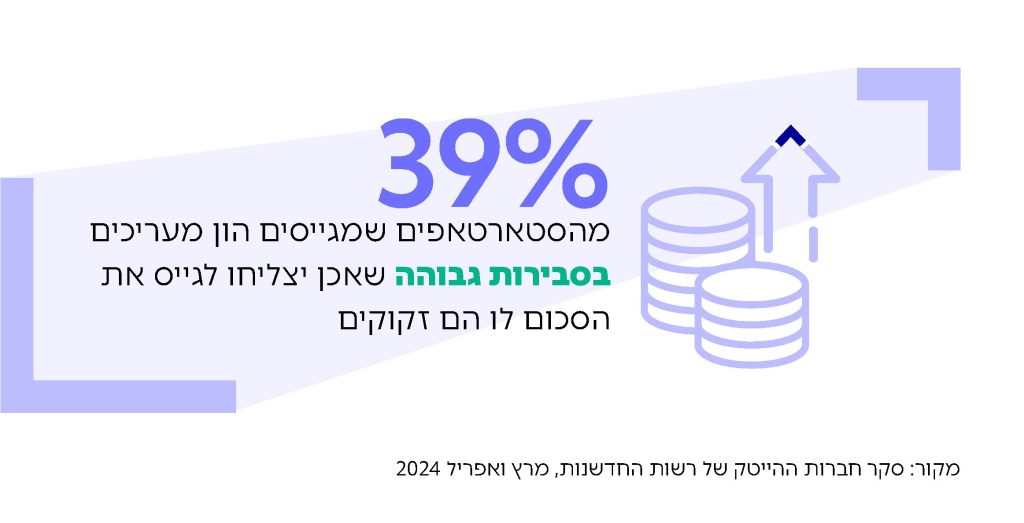 בנוסף, 36% מהחברות המגייסות העריכו במרץ ובאפריל 2024 בסבירות גבוהה שסבב הגיוס הבא שלהן יתבצע בשווי נמוך משמעותית מהשווי הנוכחי שלהן. בנובמבר 2023 שיעור זה עמד על 39%, כך שלא חל שינוי משמעותי.