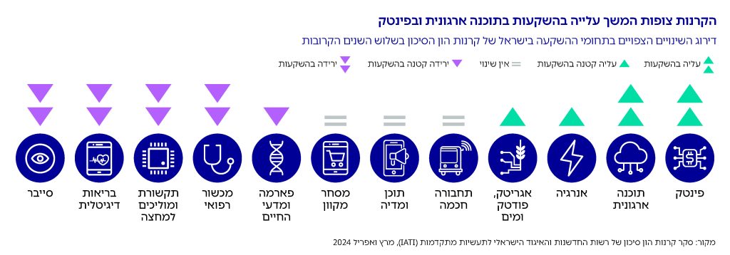 גורם משמעותי שישפיע על התפתחות הסטארטאפים בשנים הקרובות, מבחינת המשאבים שיעמדו לרשותם והכיוונים הטכנולוגיים והעסקיים בהם יתקדמו, הוא קרנות הון הסיכון בישראל. כאמור, בישראל פועלות קרנות הון סיכון ישראליות וזרות, שמשקיעות בסטארטאפים בתחומים ובשלבים שונים.4להרחבה על פעילות קרנות הון סיכון בישראל, ראו את פרסום הרשות בנושא בשיתוף IVC, KPMG ומשרד עו”ד גורניצקי.