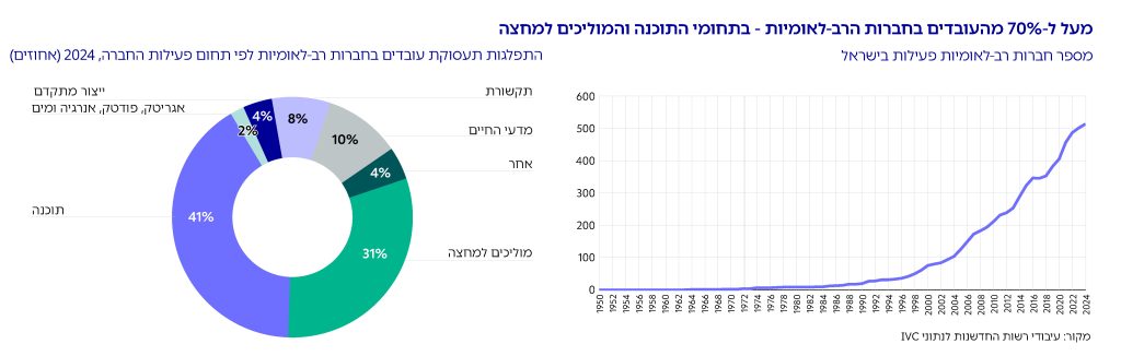 כאמור, נכון ל-2024, פועלות בישראל כ-515 חברות רב-לאומיות המעסיקות קרוב ל-90 אלף עובדים. החברות הרב-לאומיות בישראל פועלות כיום בשני תחומים עיקריים: תוכנה ומוליכים למחצה. בחברות בתחומים אלה מועסקים כ-72% מהעובדים בחברות הרב-לאומיות. תחום מדעי החיים מרכז כ-10% מהעובדים בחברות הרב-לאומיות ו-8% מועסקים בחברות בתחום התקשורת.