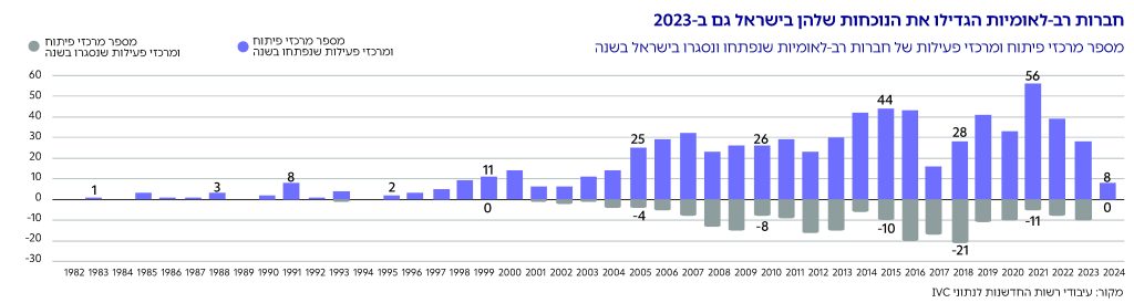 רוב החברות הרב-לאומיות החלו את פעילותן בישראל אחרי שנת 2000. בשנים האחרונות מספר מרכזי הפעילות החדשים של החברות הרב-לאומיות שקמו בישראל בכל שנה הלך ועלה. בשנים 2023-2019 קמו בממוצע כ-38 מרכזי פיתוח חדשים מדי שנה. ב-2023 חלה ירידה במספר מרכזי הפעילות החדשים שקמו, והוא עמד על 28 בלבד.