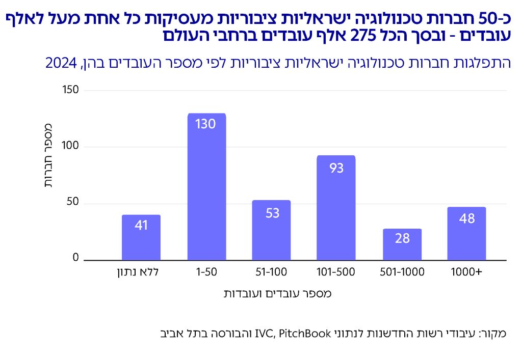 393 חברות טכנולוגיה ציבוריות ישראליות נסחרות בבורסות בעולם. שווי השוק המצרפי שלהן, נכון לאפריל 2024, הוא כ-234 מיליארד דולר והן מעסיקות כ-320 אלף עובדים ברחבי העולם. מניתוח החברות הציבוריות לפי מספר המספר העובדים והעובדות בהן עולה כי כבר כיום פועלות קרוב ל-50 חברות טכנולוגיה ציבוריות ישראליות גדולות המעסיקות מעל לאלף עובדים ומועסקים בהן בסך הכל כ-275 אלף עובדים ברחבי העולם. שווי השוק של החברות הללו עמד באפריל 2024 על כ-184 מיליארד דולר, כ-79% משווי השוק המצטבר של כלל חברות הטכנולוגיה הישראליות הציבוריות.