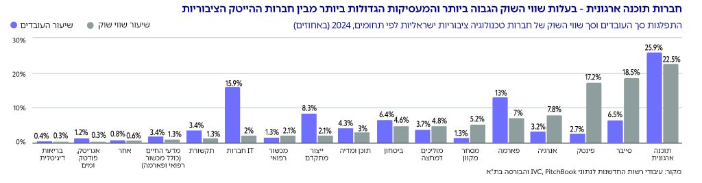 השווי של חברות הטכנולוגיה הציבוריות מרוכז בעיקר בשלושה תחומים: תוכנה ארגונית, פינטק וסייבר. שלושת התחומים האלה מהווים ביחד 58% משווי השוק של חברות הטכנולוגיה הציבוריות הישראליות. אולם, מניתוח התפלגות העובדים בחברות הציבוריות לפי תחומי הפעילות עולה תמונה מעט שונה מזו שעולה מניתוח שווי השוק. תחום התוכנה הארגונית הוא אומנם התחום בו מועסק מספר העובדים הגבוה ביותר, כ-83 אלף עובדים ברחבי העולם, אך התחומים הבאים בגודלם אחריו במונחי עובדים הם חברות ה-IT, בהן מועסקים כ-51 אלף עובדים, פארמה (42 אלף) וייצור מתקדם (26 אלף). כלומר, מהניתוח עולה כי לא קיים מתאם בין שווי השוק של החברות למספר העובדים בהן.