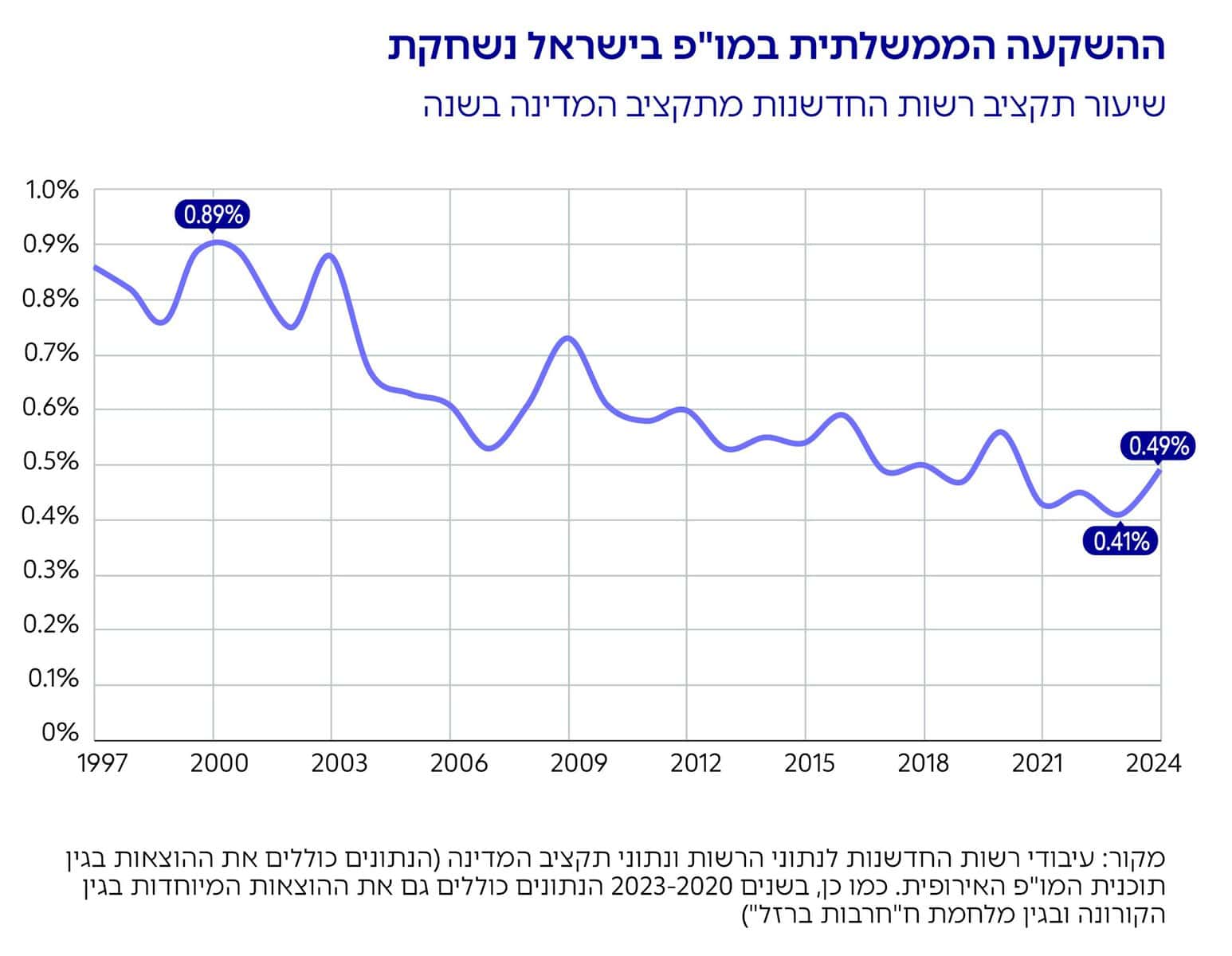 בנוסף, נהוג להתייחס לתקציב המדינה כאל ביטוי לסדר העדיפויות הכלכלי והחברתי הלאומי. כאשר בוחנים את שיעורו של תקציב רשות החדשנות, הגוף הממשלתי האמון על קידום תעשיית ההייטק בישראל, מתוך תקציב המדינה הכולל, ניתן לזהות שחיקה רצופה לאורך עשרים השנים האחרונות. תקציב הרשות נשחק בחצי מכ- 0.9% מסך תקציב המדינה ב-2000 לכ-0.41% בלבד ב-2023. בתקופה של למעלה מעשרים שנה תקציב הרשות גדל מכ-1.6 מיליארד שקלים לכ-2 מיליארד שקלים בלבד ב-2023, כאשר כל הגידול מוסבר על ידי עלייה בהוצאה הממשלתית בגין ההשתתפות בתוכנית המו”פ האירופית (Horizon Europe). זאת בשעה שתקציב המדינה כולו גדל מכ-180 מיליארד שקלים לקרוב לחצי טריליון שקלים.