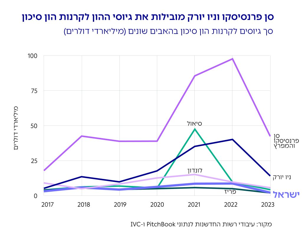דוגמה לתחרות הגוברת של ישראל היא לונדון. כפי שציינו, סך הגיוסים לחברות טכנולוגיה בהאב עקף את זה של ישראל. גם בזירת קרנות הון הסיכון, לונדון עקפה את ישראל. בין השנים 2023-2017 גויסו כ-27 מיליארד דולר לקרנות הון סיכון ישראליות בעוד שבלונדון הנתון עומד על כ-58 מיליארד דולר.