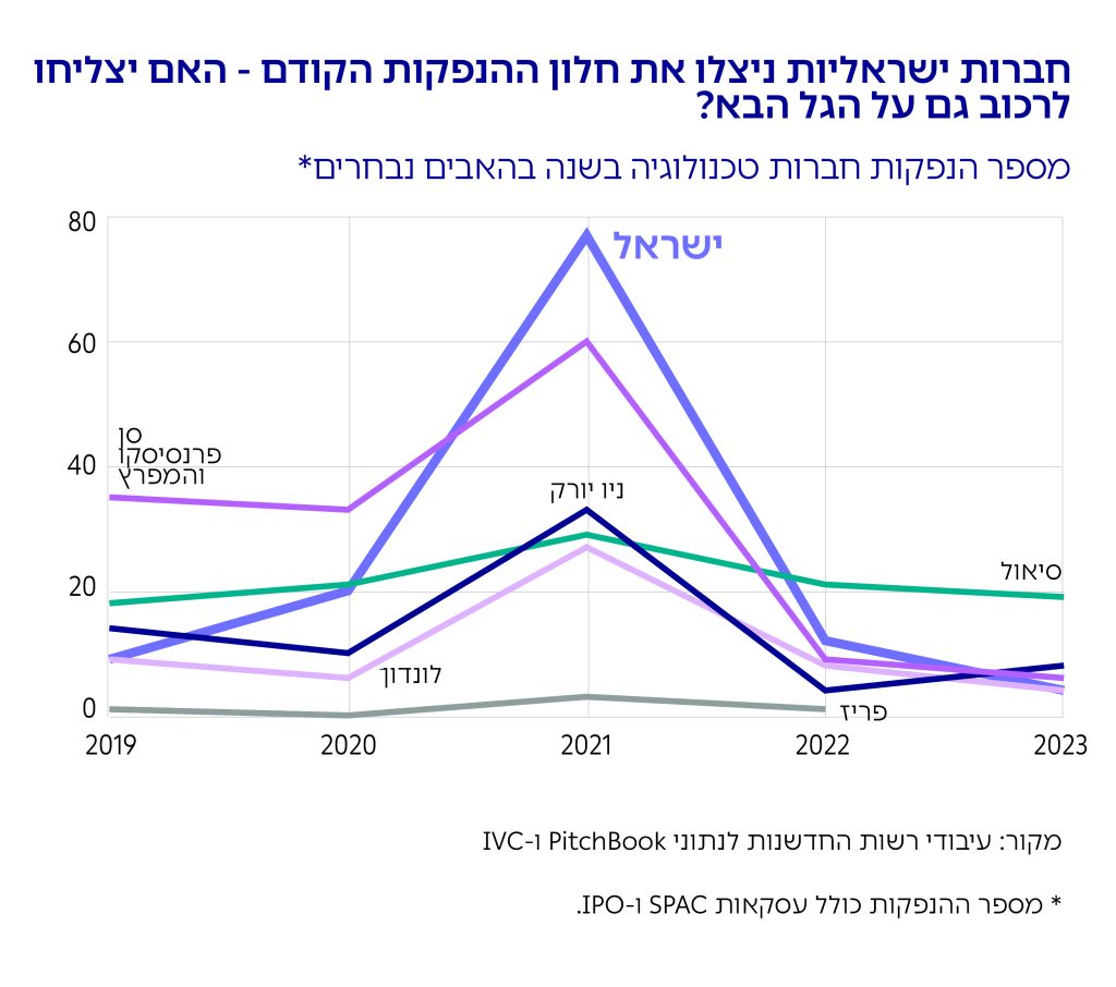 ב-2021 הגיע לשיאו גל ההנפקות העולמי האחרון. בחינה של מספר ההנפקות של חברות טכנולוגיה בהאבים בולטים מגלה שמעל ל-70 חברות ישראליות ניצלו את ההזדמנות להפוך לציבוריות (באמצעות SPAC או IPO), כך שישראל עקפה באותה שנה את עמק הסיליקון ואת ניו יורק במונחי הנפקות. ב-2022 נסגר חלון ההנפקות, ועדיין מספר ההנפקות בישראל היה שני רק לזה שבסיאול. ב-2023 המשיכה מגמת הירידה ברוב ההאבים (למעט ניו יורק, בו נרשמה התאוששות קלה, וסיאול, ששמרה על רמה דומה לאורך כל התקופה).
