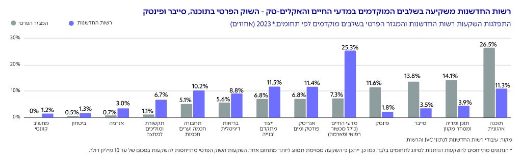 מניתוח פעילות ההשקעות בסטארטאפים בסבבים שגודלם עד 10 מיליון דולר, עולה כי עיקר ההשקעות בשוק הפרטי בשלבים המוקדמים מתרכזות בתחומי התוכנה (26.5% מההשקעות עד 10 מיליון דולר הן בתחום התוכנה הארגונית). לעומת זאת, השקעות הממשלה בהייטק המבוצעות על ידי רשות החדשנות, הן בעיקר בתחומי מדעי החיים והאקלים-טק. בחינה של התפלגות השקעות רשות החדשנות אל מול השקעות השוק הפרטי ב-2023 מגלה כי רשות החדשנות משקיעה בתחומים בהם השוק הפרטי ממעט להשקיע.