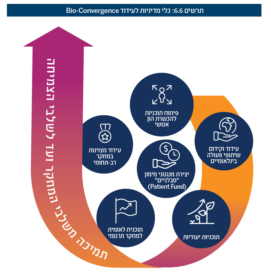 לצד הפוטנציאל הגדול הגלום בתחום, בפני תעשיית ה-Bio-Convergence ניצבים גם אתגרים רבים מכיוון שהתחום מצוי בראשיתו ומאופיין בסיכונים רגולטוריים, קליניים ופיננסיים גבוהים.31 רשות החדשנות פועלת לרוחב היריעה בשיתוף גופים נוספים, הכוללים את מל”ג, מפא”ת, משרד הבריאות, משרד המדע, ישראל דיגיטלית ועוד. עבודה משותפת זו יוצרת אקו-סיסטם תחרותי שיתמוך בקידום תחום ה-Bio-Convergence בישראל. שיתוף פעולה זה עתיד להתמקד בתחומים הבאים: