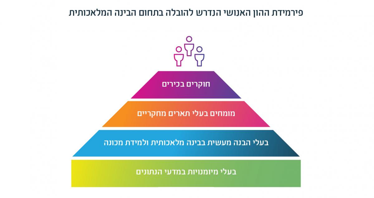 האתגר השני הוא טיפוח כלל פירמידת ההון האנושי הנדרשת בתחום. בקצה העליון של הפירמידה נמצאים החוקרים הבכירים המתמחים באלגוריתמים. חוקרים אלו נדרשים הן באקדמיה, לקידום המחקר וטיפוח הדור הבא של המומחים, והן בתעשייה. בפרט, ענקיות הטכנולוגיה מציעות להם משכורות עתק, ובארה”ב, לדוגמה, תופעה זו כבר מאיימת על מוסדות המחקר. לפיכך, יש להגדיל את היצע החוקרים הללו ולהציע להם תמריצים מתאימים. אחרי החוקרים הבכירים, נמצאים מומחי בינה מלאכותית בעלי תארים מחקריים. הביקוש לעובדים כאלו, המחזיקים בבסיס מדעי רחב, הוא גבוה כבר כיום, וגם הם משמשים כערוץ העברת ידע חשוב בין האקדמיה לתעשייה. נוסף עליהם, ישנו ביקוש גבוה לעובדים בעלי הבנה בבינה מלאכותית ובלמידת מכונה, לתפקידי פיתוח יישומיים, וכן לעובדים בעלי הכשרה במדעי הנתונים – תופעה אותה תיארנו בהרחבה בפרק “הייטק בישראל 2018” בדוח זה. חשוב לציין כי מדעי הנתונים7 המשמשים כבסיס חשוב לבינה מלאכותית, נפרטים אף הם לפירמידה שלמה של מיומנויות. אף שהאקדמיה היא ערוץ הכשרה מרכזי גם לתפקידים היישומיים שבבסיס הפירמידה, ערוצים נוספים שמתפתחים בהובלת גופי תעשייה ומוסדות חוץ-אקדמיים צפויים לשחק תפקיד חשוב בפיתוח היצע ההון האנושי בתחום.