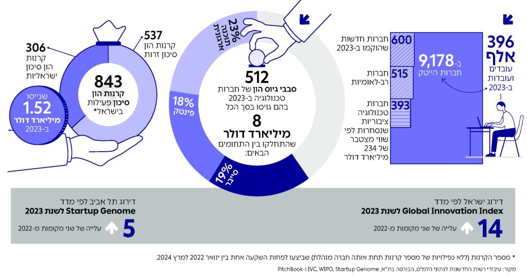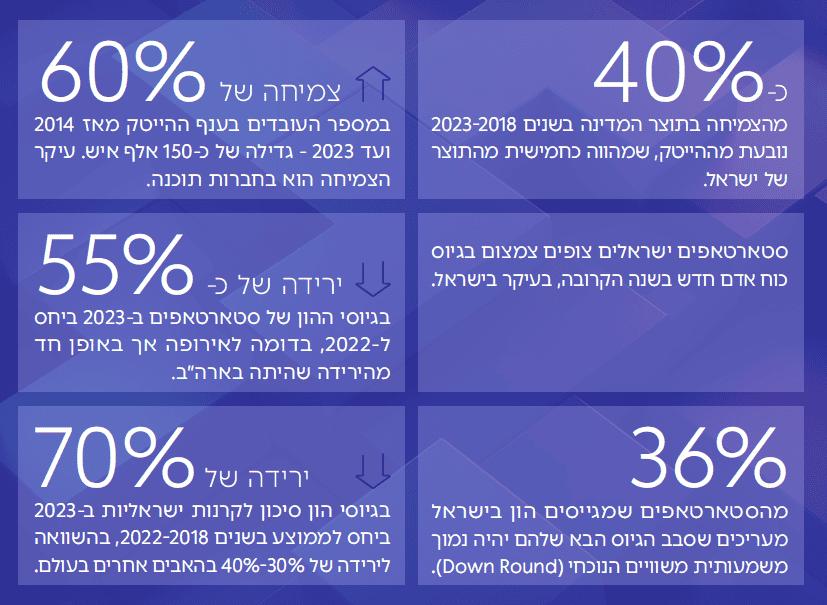 במדדים מאקרו-כלכליים מרכזיים, ובראשם גודל תוצר ההייטק וייצוא הענף, המשיכה העלייה גם ב-2023. מצד שני, נרשמה ירידה בשורה של מדדים משמעותיים: ראשית, הצמיחה בתעסוקה בהייטק התמתנה ועמדה ב-2023 על 2.6% – כלומר, קצב גבוה מעט יותר מקצב הגידול הטבעי של האוכלוסייה בישראל. מדד זה הוא משמעותי, שכן לתעסוקה בענף יש השפעה משמעותית על הכנסות המדינה ממיסים, תוצר המדינה וכו’. מדדים רבים הקשורים לפעילות העסקית בהייטק חזרו לרמות שאיפיינו אותם ב-2018 או לפני כן, כולל גיוסי ההון לסטארטאפים ולקרנות הון סיכון ישראליות. גיוסי ההון של סטארטאפים ב-2023 ירדו ב-55% – ירידה חדה יותר מזו שנצפתה בהאבים בארה”ב ובחלק מההאבים האירופאיים.