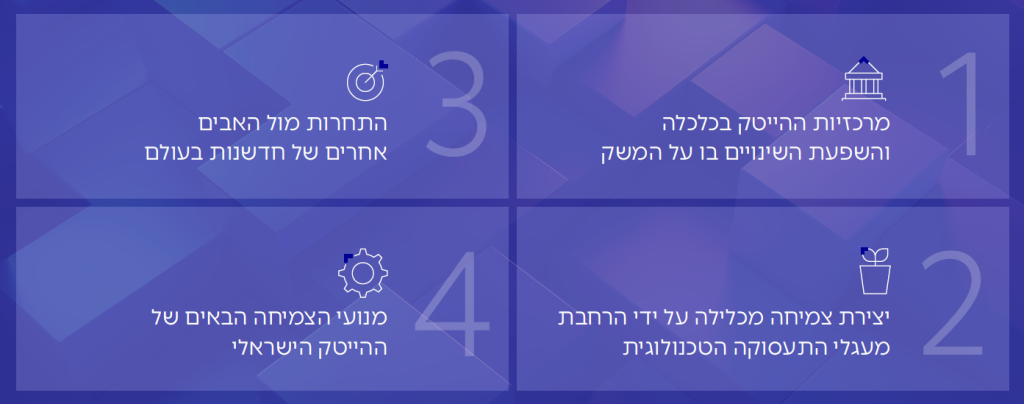 בטווח הקצר, תפקיד המדיניות הכלכלית הוא לנהל את ציפיות השוק ולייצר ודאות כדי לשקם את המוניטין של ישראל כיעד אטרקטיבי למשקיעי הייטק. כמו כן, למען הצמיחה ארוכת הטווח של ההייטק, חשוב להשקיע בחינוך איכותי לכלל קבוצות האוכלוסייה, בכל רחבי הארץ, ובשלבים שונים לאורך המסלול החינוכי והמקצועי.