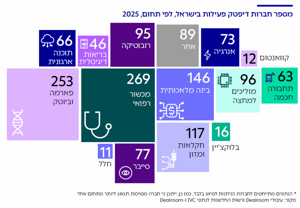 במספר תחומים בולטת הנוכחות של חברות דיפטק ישראליות ברמה הגלובלית, באופן יחסי לגודלו של האקוסיסטם הישראל. חברות סייבר ישראליות המוגדרות גם כחברות דיפטק גייסו בשנים 2019-2025 כ-2.4 מיליארד דולר – למעלה מ-20% מסך גיוסי ההון של חברות דיפטק בתחום הסייבר בעולם. גם בתחומי המכשור הרפואי וחקלאות ומזון חברות דיפטק ישראליות גייסו חלק משמעותי מסך ההון שגויס לחברות דיפטק בעולם – חברות דיפטק ישראליות בתחומים אלה משכו כ-9-10% מכלל גיוסי ההון בעולם.