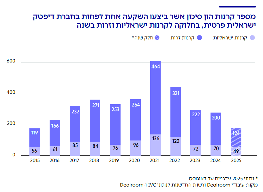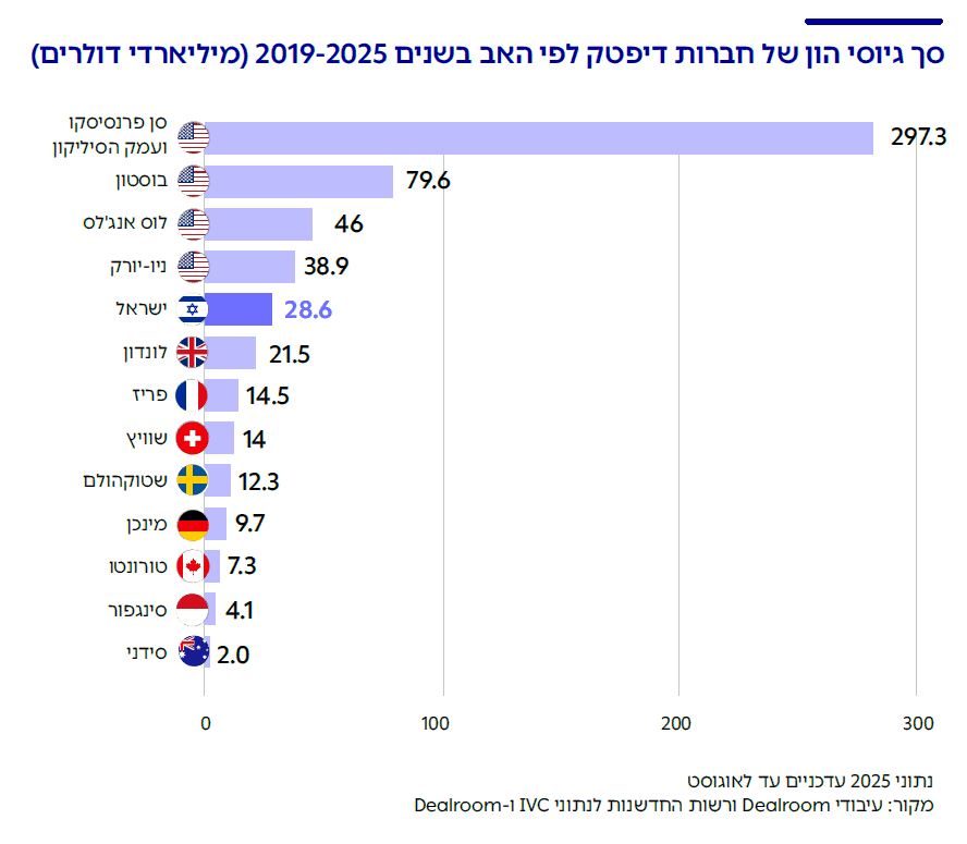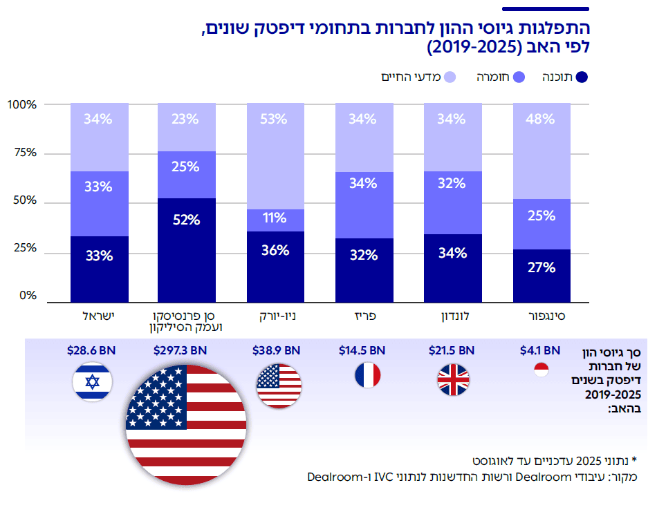 מניתוח הנתונים עולה כי נכון למועד פרסום הדו"ח, בישראל פועלות למעלה מ-1,500 חברות דיפטק,2לצורך הניתוח, כל חברת טכנולוגיה ישראלית סווגה על פי ההגדרה לעיל כחברת דיפטק או לא. הסיווג בוצע במשותף על ידי Dealroom ורשות החדשנות על בסיס נתוני Dealroom ו-IVC. מתוך מספר זה, כ-1,300 חברות מנהלות את מרכז הפעילות שלהן בישראל וביצעו סבב גיוס. עוד כ-100 חברות ביצעו סבב גיוס אך העבירו את מטה הפעילות המרכזי שלהן מישראל (ושומרות על פעילות מקומית מסוימת) ועוד כ-130 חברות שמרכז הפעילות שלהן בישראל אך טרם ביצעו סבב גיוס שגייסו בין השנים 2019-2025 יותר מ-28 מיליארד דולר.3טווח השנים 2025-2019 נבחר כדי להציג תמונת מצב אמינה וארוכה דיה. לאור האירועים המרובים בעולם ובישראל שהחלו עם פרוץ מגפת הקורונה ב-2020, נבחרה שנת 2019 כנקודת ההתחלה סכום זה מהווה כ-36% מסך ההון שגויס על ידי חברות הייטק ישראליות בתקופה זו.4סך גיוסי ההון בפרסום המשותף לרשות החדשנות ול-Dealroom נמוך בכ-15% מסך גיוסי ההון הקיים בנתוני IVC בתקופה זו כתוצאה מהבדלי הגדרות נתון זה מציב את חברות הדיפטק הישראליות במקום ה-5 בעולם במונחי גיוס הון, ובמקום הראשון מחוץ לארה"ב. עוד עולה מן הנתונים כי 270 קרנות הון סיכון השקיעו בחברת דיפטק ישראלית אחת לפחות ב-2024, כרבע מהן ישראליות.