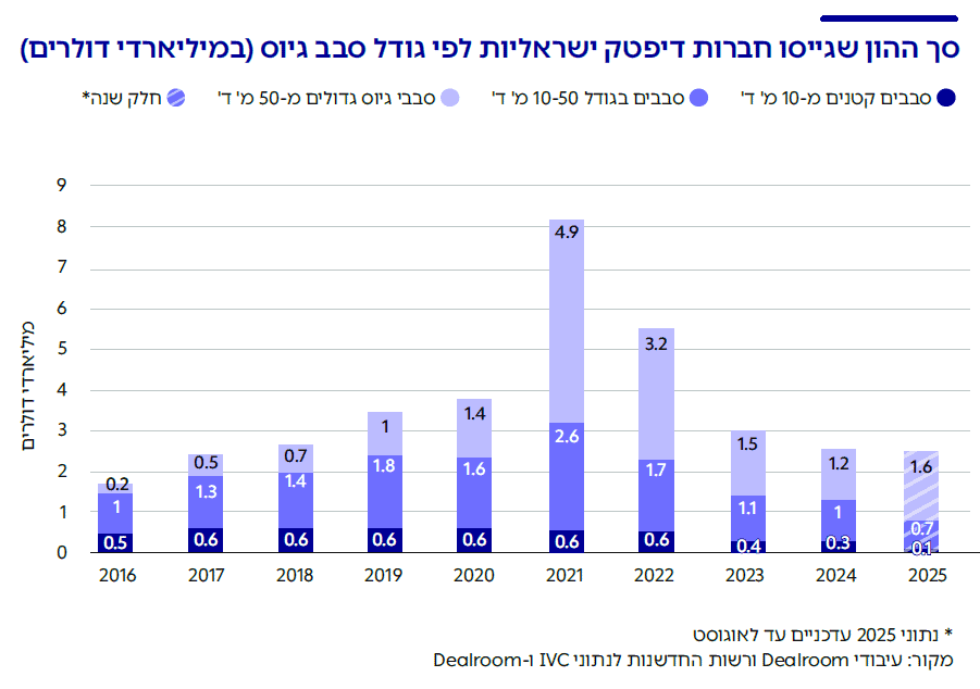 בשמונת החודשים הראשונים של 2025 נראה כי מגמה זו נמשכת, כאשר סבבים גדולים מהווים כ-65% מכלל ההשקעות בחברות דיפטק. עם זאת, נתון זה צפוי לרדת מעט מכיוון שסבבי גיוס בסכומים נמוכים קשים יותר לאיתור (בעיה המוכרת כ-Late Detection).