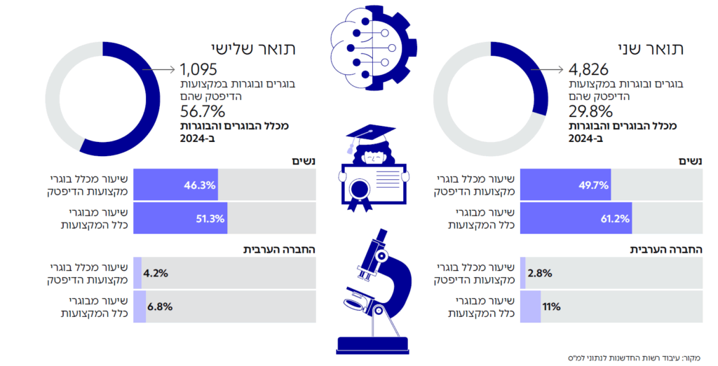 מהנתונים עולה כי מספר בוגרי התארים המתקדמים במקצועות הדיפטק עולה בעקביות במשך יותר מעשור בקצב גבוה מקצב גידול האוכלוסייה. עוד עולה מהנתונים כי ב-2024 סיימו תואר מתקדם במקצועות הדיפטק כ-6,000 בוגרים, שהם כשליש מכלל בוגרי התארים המתקדמים. מתוכם כ-5,000 בוגרי תואר שני ו-1,000 תואר שלישי (דוקטורט). כשליש מהבוגרים הם במקצועות הרפואה והביולוגיה ועוד כ-20% הם במקצועות מדעי המחשב, הנדסת חשמל ומתמטיקה.