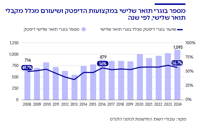מגמה דומה קיימת בתארים שלישיים: מספר בוגרי מקצועות הדיפטק עלה מכ-700 בממוצע בשנה בין השנים 2008-2013 ליותר מ-1,000 בוגרים ב-2024 – גידול של כ-3%. מספר בוגרי התארים המתקדמים במקצועות הדיפטק גדל בקצב מהיר יותר מקצב גידול האוכלוסייה בתקופה זו.8אוכלוסיית ישראל גדלה בכ-24% בין 2013 ל-2024, ובכ-37% מאז 2008