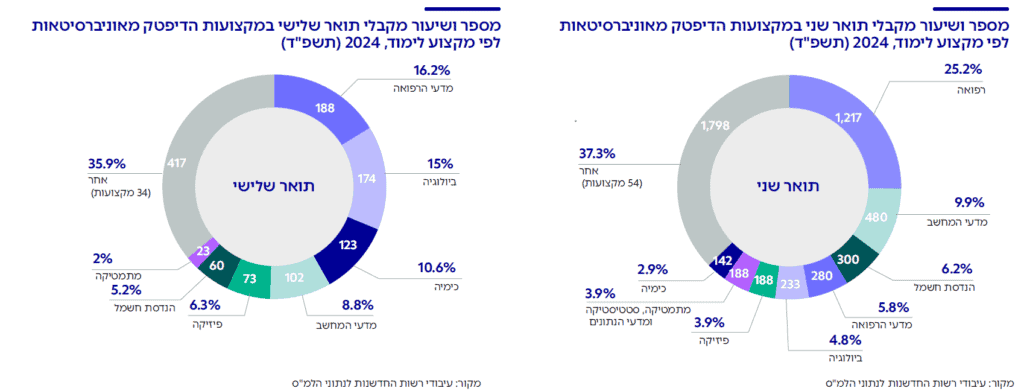 התחום הפופולרי ביותר ללימודי תואר שני במקצועות הדיפטק הוא מסלול לימודי הרפואה, עם כרבע מהבוגרים. בתחומי הביולוגיה ומדעי הרפואה סיימו קרוב ל-11% בוגרים נוספים. במקצועות המזוהים ביותר עם ענף ההייטק – מדעי המחשב, מתמטיקה והנדסת חשמל – סיימו כ-20% מבוגרי התואר השני במקצועות הדיפטק. בלימודי תואר שלישי התמונה דומה: בוגרי ביולוגיה ומדעי הרפואה מהווים כ-31% מכלל הבוגרים, בעוד שבוגרי מדעי המחשב, הנדסת חשמל ומתמטיקה מהווים כ-16%.